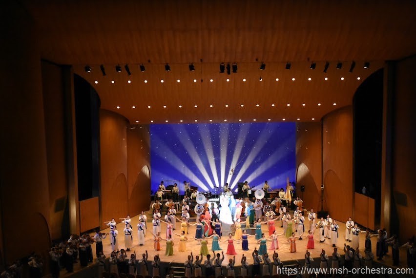 管楽器にくわえ、オケストならではの弦楽器のマーチング。さらに普段はあまり動きをみせない楽器まで、シンガー、パフとともに舞台で縦横無尽に展開する圧巻かつ感動のステージでした。