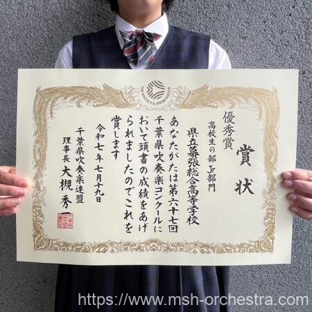 これは、日頃の幕総オケ部の活動及び、演奏が高く評価さ れ、最高賞となったものです。