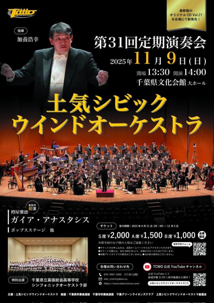 2025年11月9日(日)、千葉県文化会館にて開催される「第31回 土気シビックウインドオーケストラ 定期演奏会」に出演いたします。