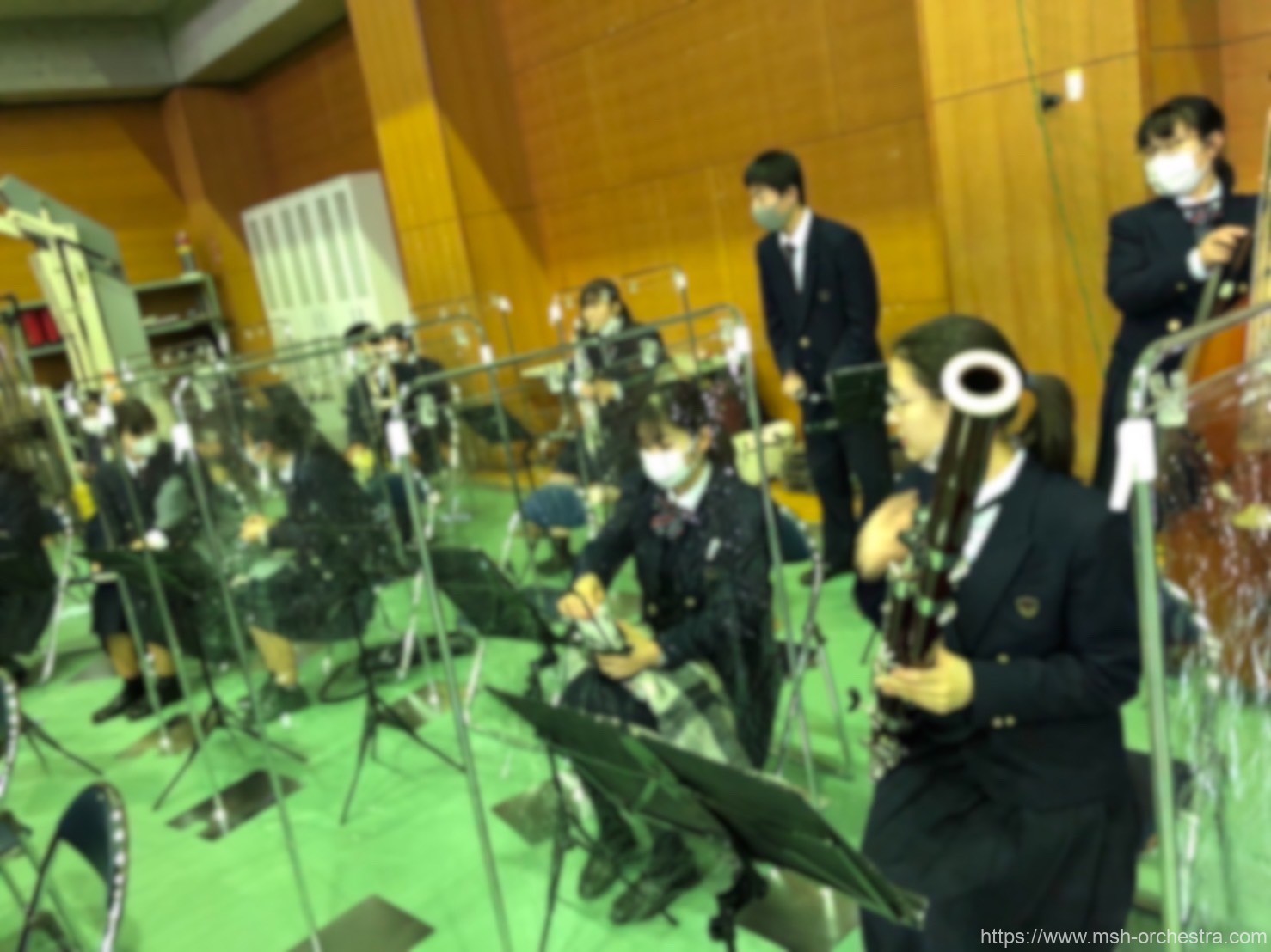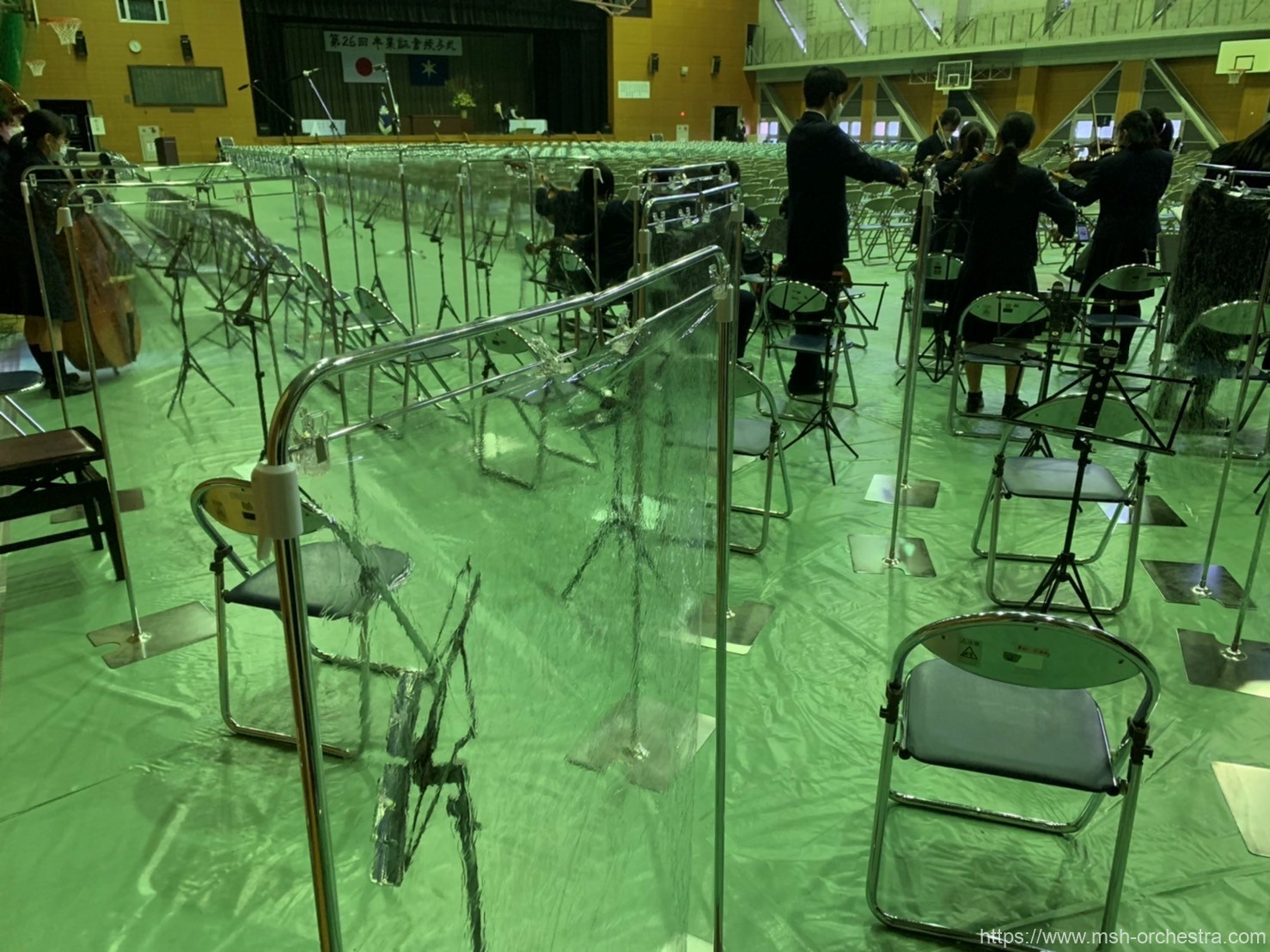 (例えば、本校の卒業式では、こちらの添付写真の通りの入念な感染対策を実施した上で、問題視されている管楽器を含めたオーケストラにより、本校3年ぶりの卒業式演奏を行うことが実現しました。企画当初は管楽器を加えることはできませんでした。)