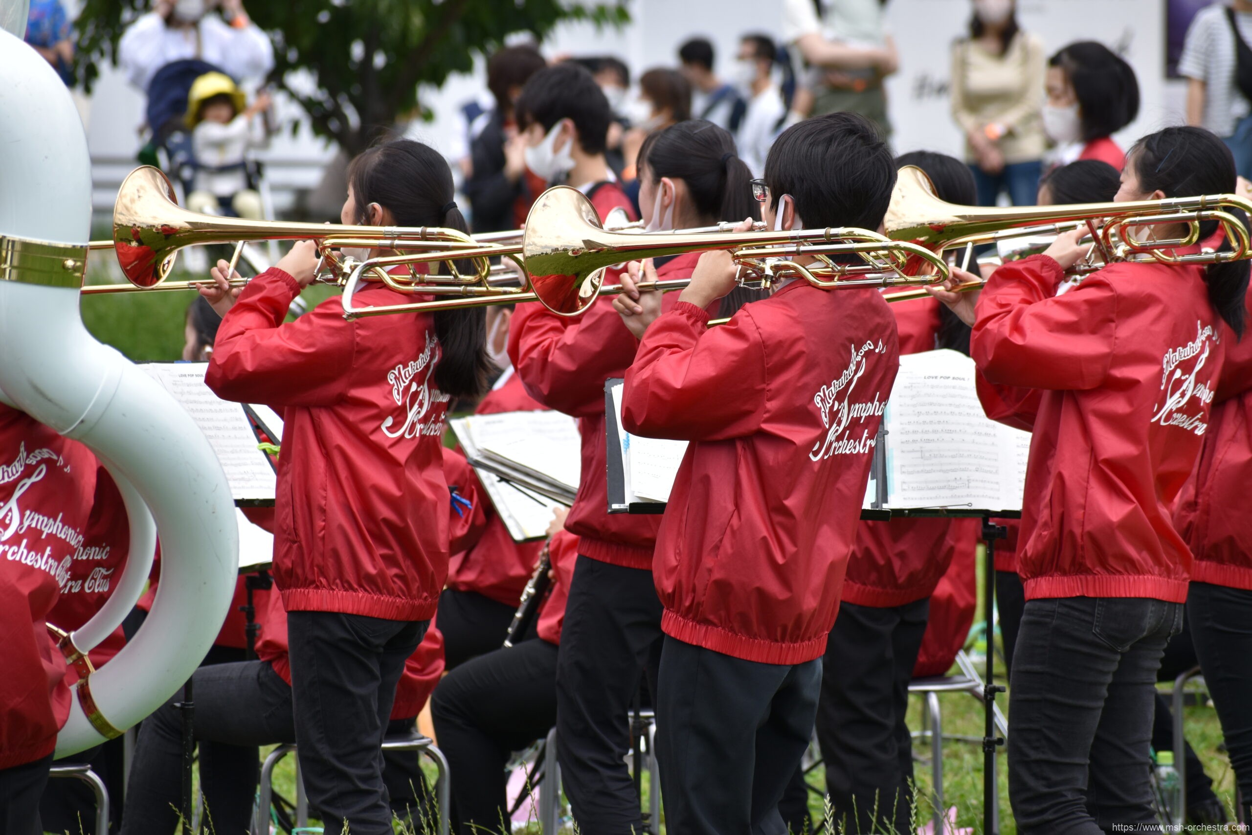 今回は管楽器の3年生を中心とした編成で、Jpopメドレーやアンパンマンなど、よく知られた曲を中心にお届けしました。天気が心配されましたが、本番を迎えるころには雨もすっかり上がり、部員が着ている赤いジャンパーが公園の緑に良く映えました。
